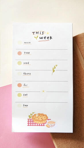 a weekly planner in the form of a memo pad to keep track of your busy days.Specifications:- Beige/off-white colour- Each handmade memo pad contains 30x sheets- Approx Size: 7.4" x 4.1"- Printed on 75 gsm paper- Includes sturdy cardstock backing*Please note that the colours may slightly vary in person